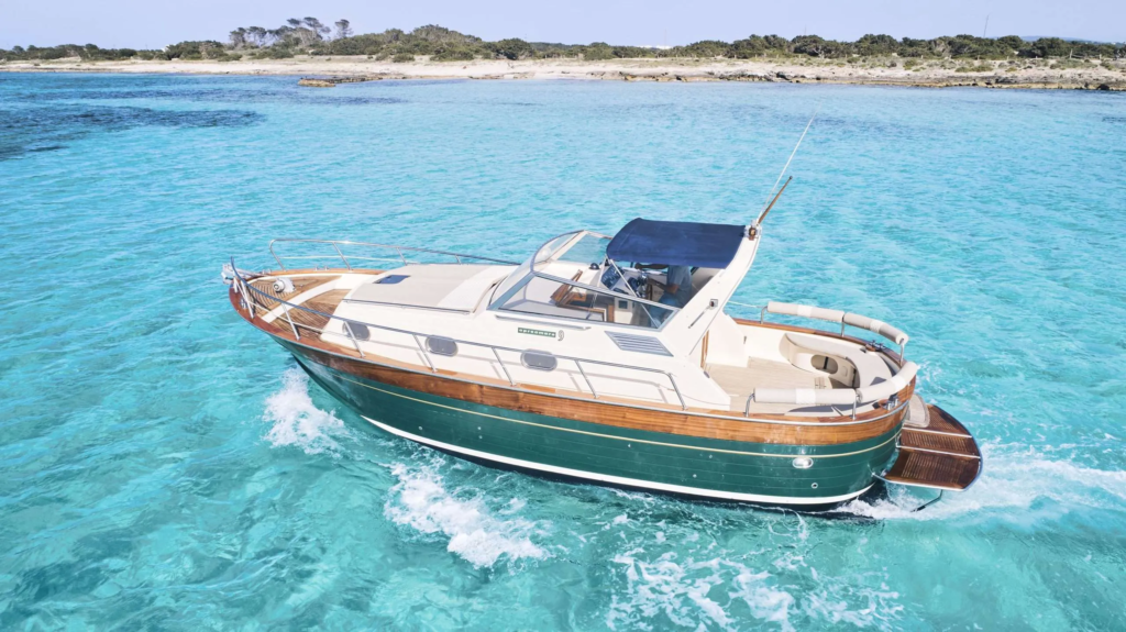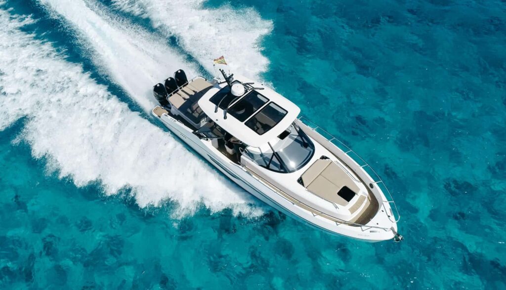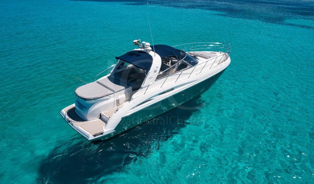 El Sunseeker Mohawk 29 es una excelente opción para familias y grupos de amigos que desean disfrutar de un crucero por Ibiza y Formentera mientras toman el sol en las grandes tumbonas delanteras y traseras o se relajan bajo la sombra bimini.