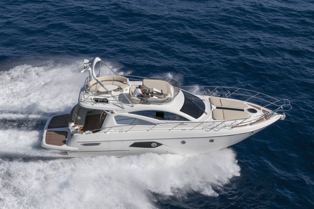 El Cranchi 43 Fly es un yate de planeo con flybridge de 13,80 metros con 2 camarotes de invitados y un calado de 1,08 metros que puede alcanzar velocidades de hasta 31 nudos. El yate con una clase de certificación CE (B) y puede navegar a no más de 200 millas de la costa.