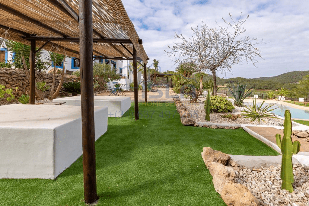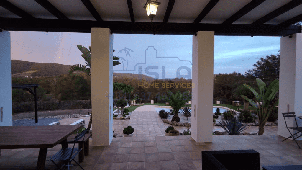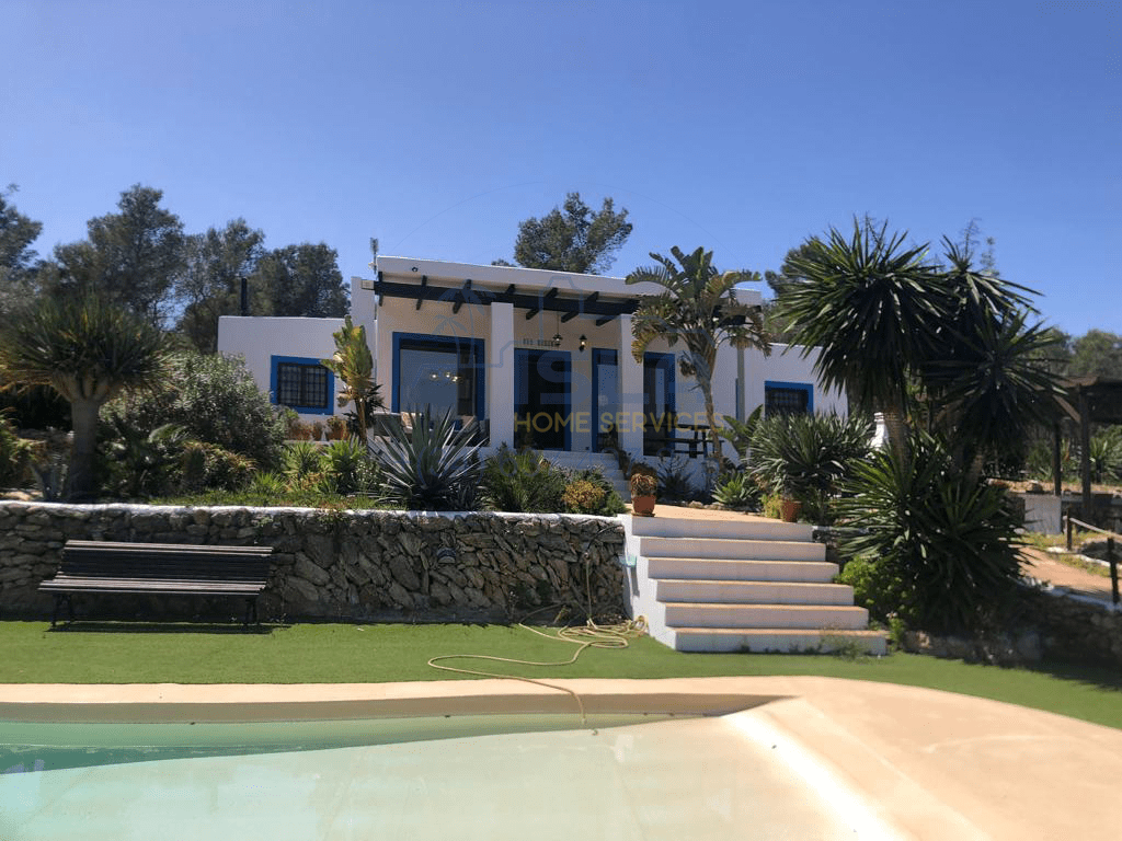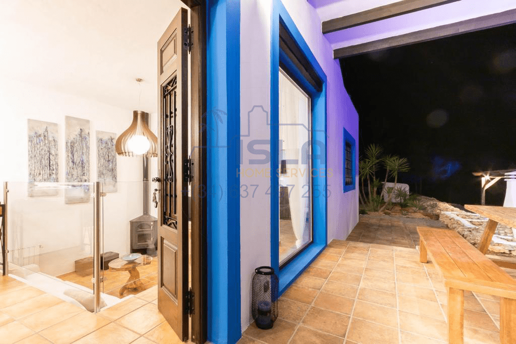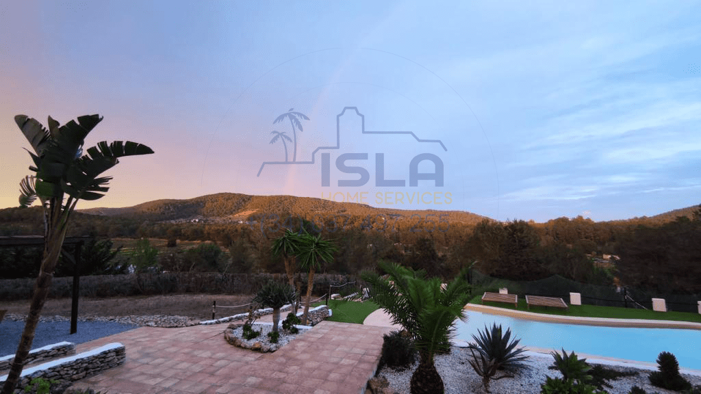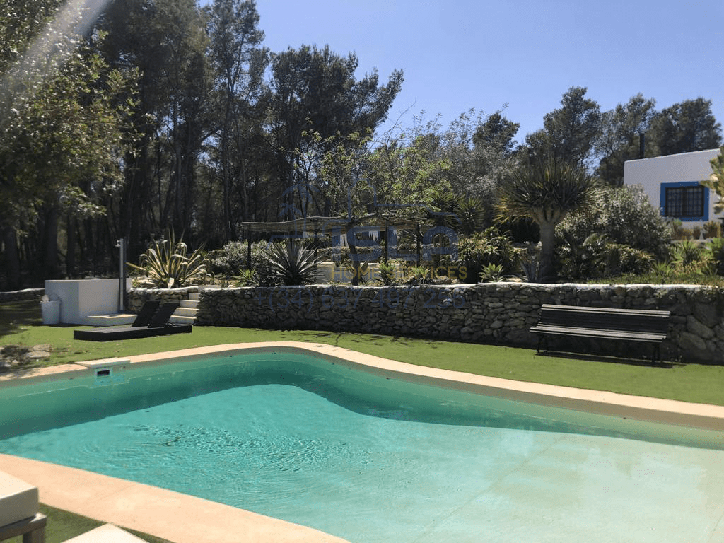 Exclusiva casa de estilo ibicenco, con blancas paredes que contrastan con el cielo azul y el verde de los campos que la rodean.. situada en el centro de la isla en un paraje incomparable, con vistas a un precioso valle y las montañas, en lo que podríamos llamar un paraíso de naturaleza típica de la isla para quien quiera disfrutar de absoluta tranquilidad en una de las zonas más auténticas y menos explotadas turísticamente, pero a la vez muy cerca de todo: de la playa, los pueblos de Santa Gertrudis, San Rafael y San Mateo. A tan sólo 15 minutos de Ibiza.