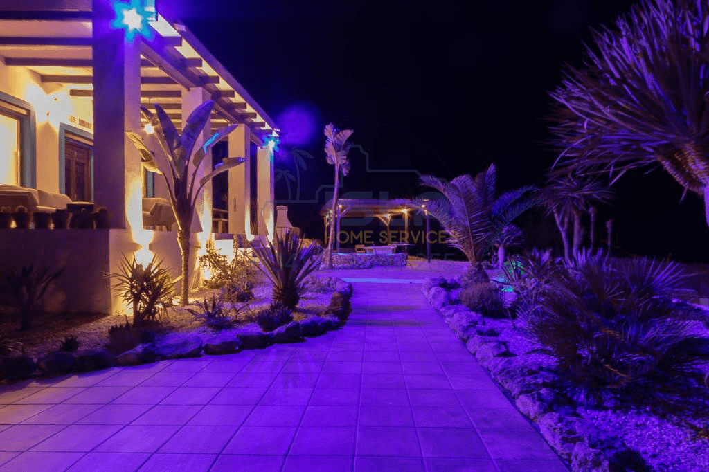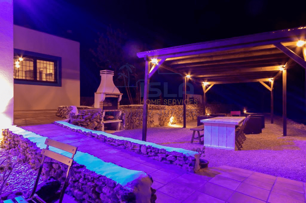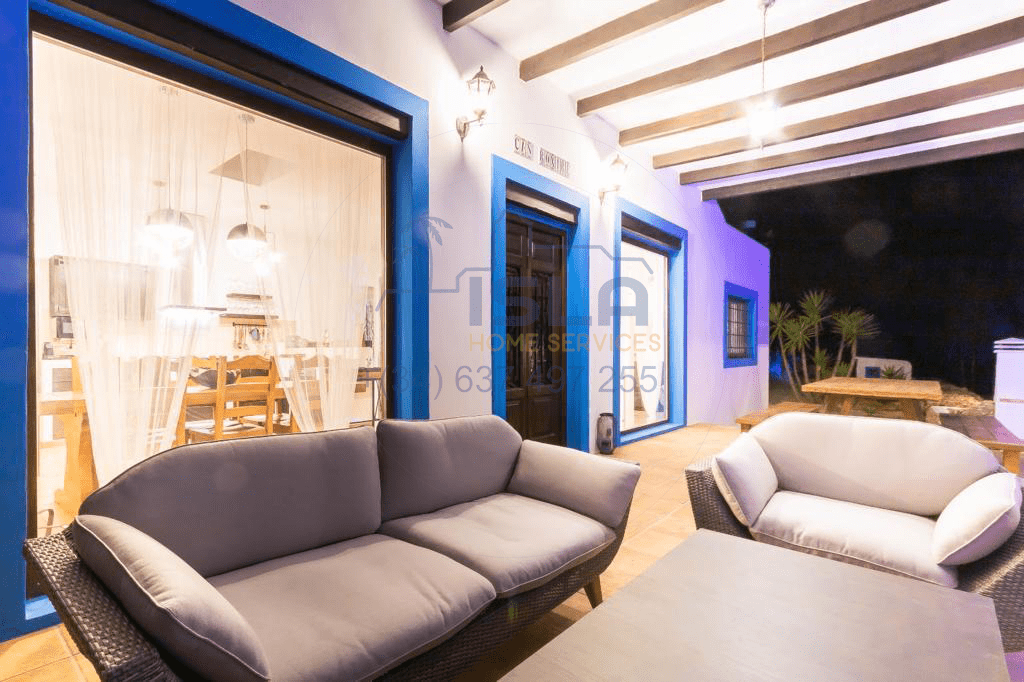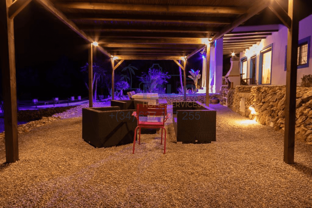 La casa principal con 150m² construidos, 500m² de terrazas y 1000m² de jardines en una finca de 3750m², dispone de tres dormitorios dobles en suite, también dispone de una casa para invitados tipo loft con aire acondicionado frío calor, , con lo que la villa puede albergar hasta 8 personas confortablemente. 3 de las habitaciones tienen TV además de internet SatTV y Smart TV en el comedor.