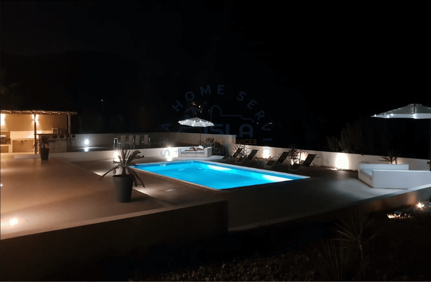 El área exterior cuenta con un privado. área de estacionamiento, algunas áreas de descanso y comedor. El amplio jardín es completamente amueblado con tumbonas, tumbonas e incluso tiene un bar en la piscina.